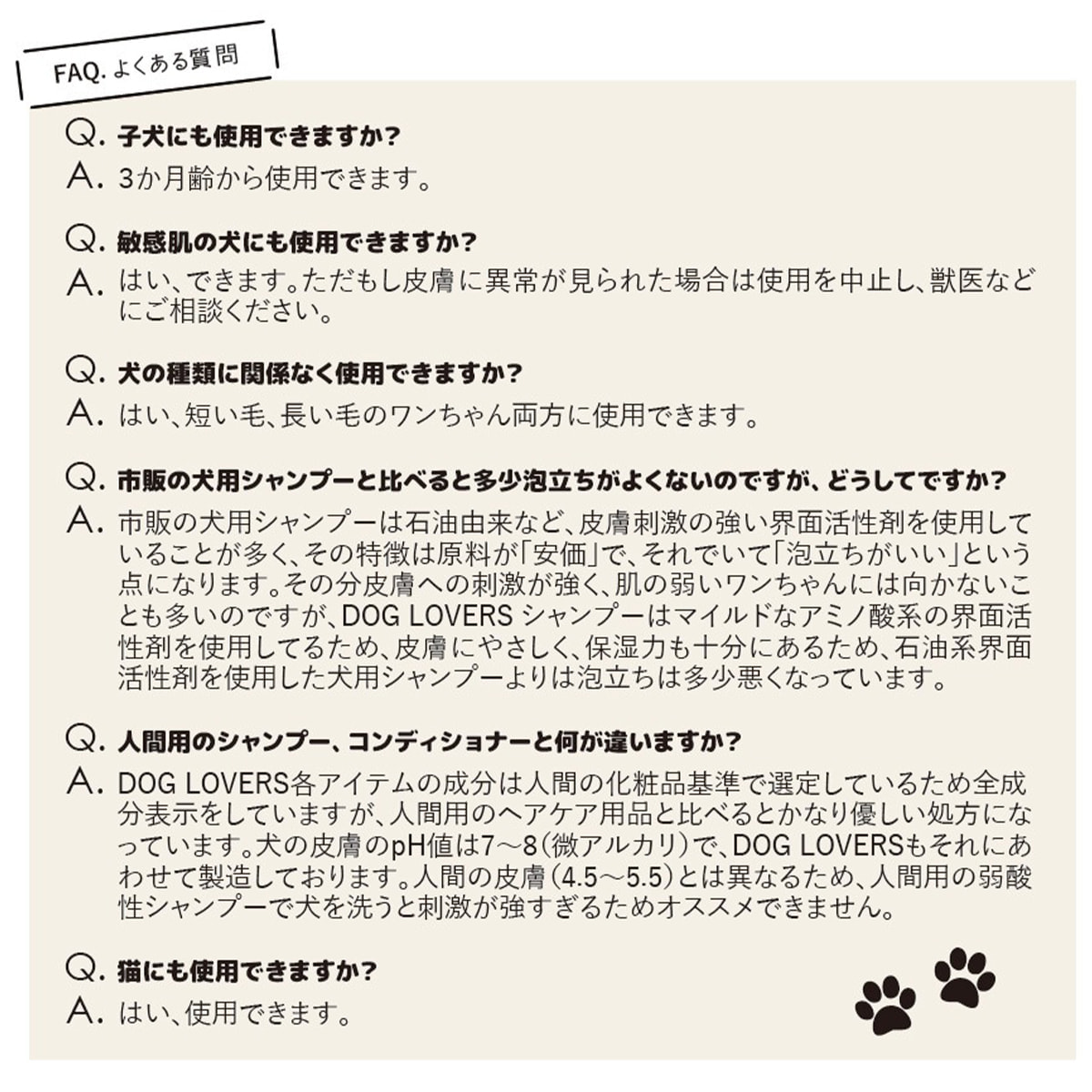 人間の皮膚は弱酸性、犬の肌は一般的に中性から微アルカリ性のため、犬の皮膚の微アルカリ(7~7.5)にあわせた処方です。