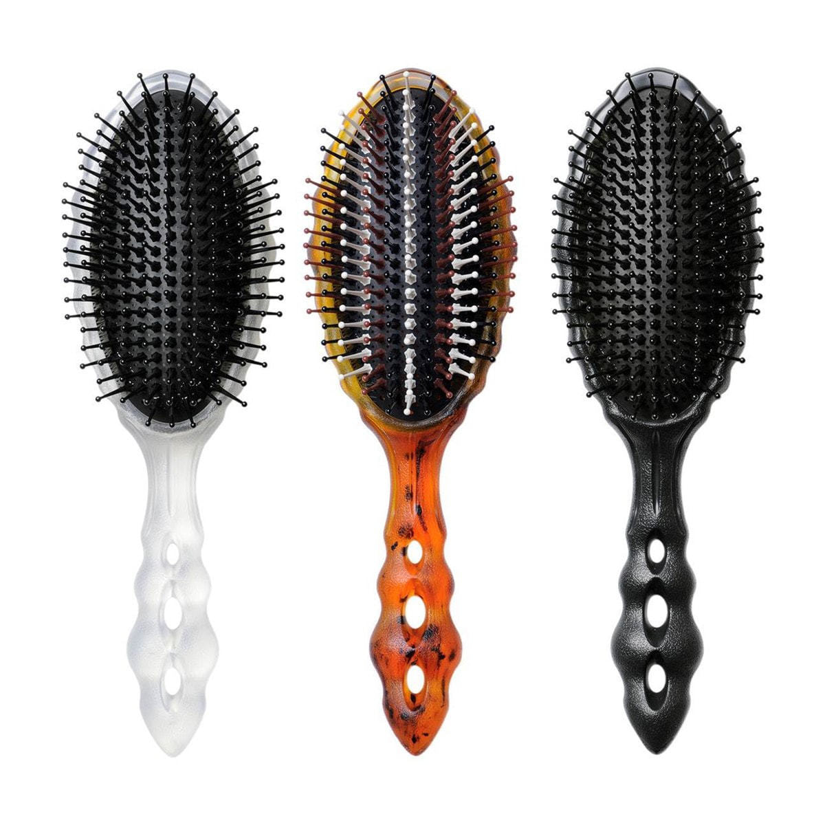 ①六角形のピンとクッションの穴がドライヤーによる対流や風の抜けの良さを実現し、髪が乾く時間自体の短縮につながります。