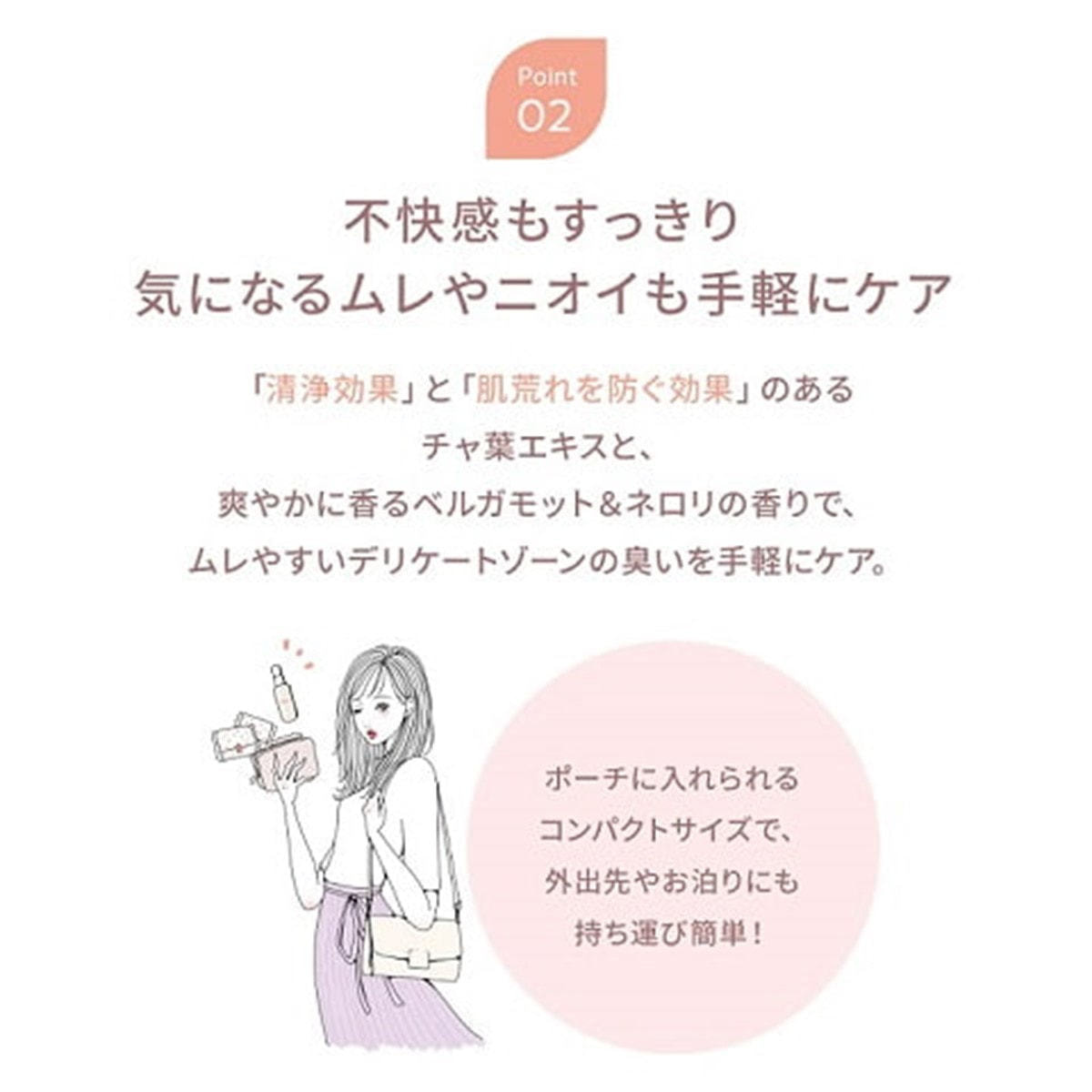 デリケートゾーンのpHに配慮し、フェミニンフローラのバランスを整え、外出先でも気になったときにすぐ使えます。