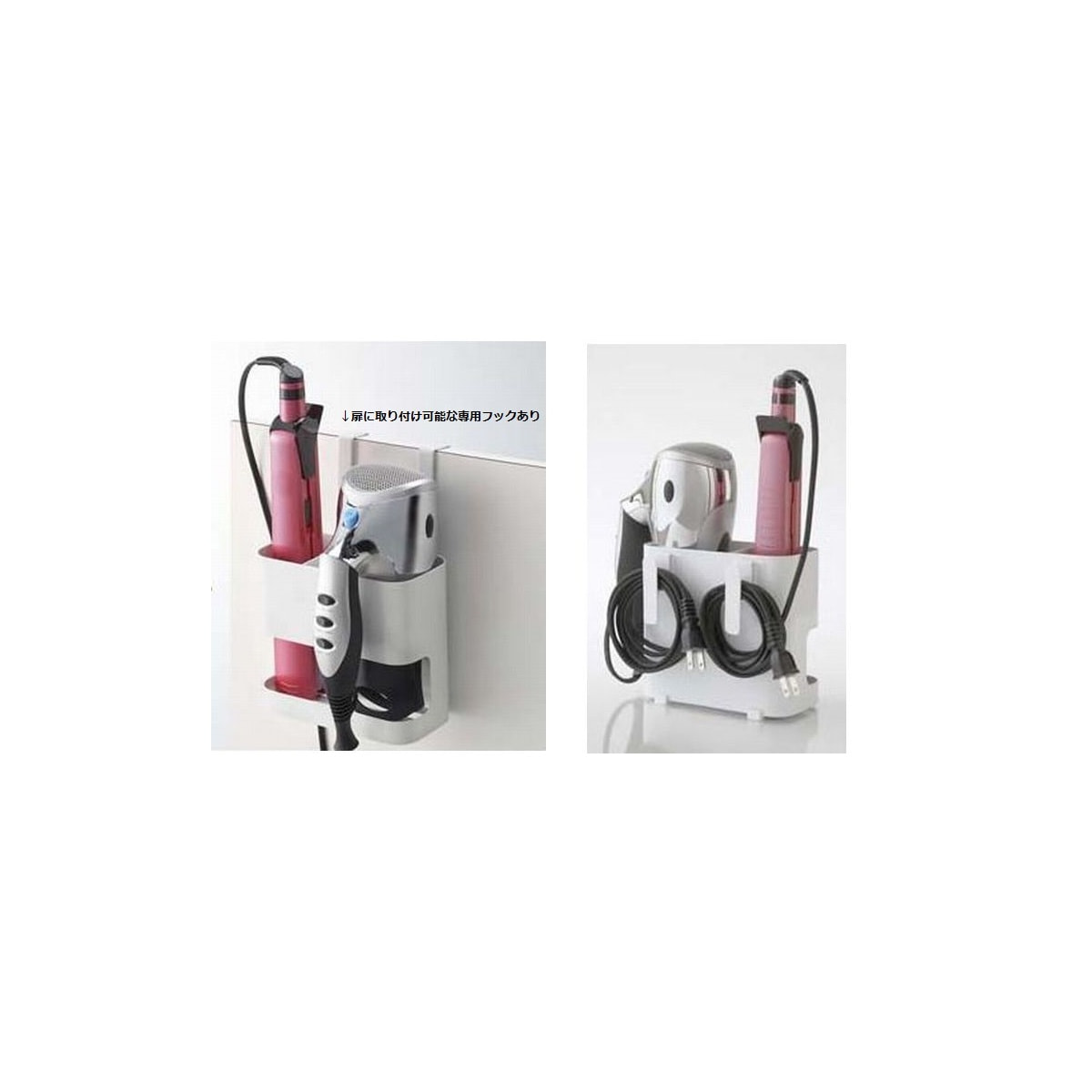 ドライヤーとヘアーアイロンを同時に収納。扉や鏡にも取り付け可能。