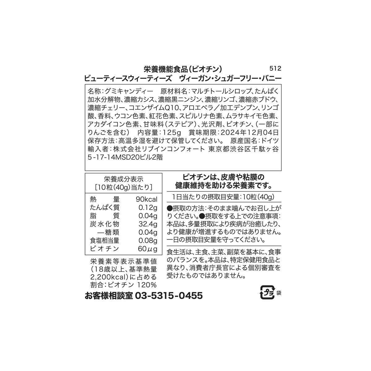 商品名:ビューティースウィーティーズ ヴィーガン・シュガーフリー・バニー 125g【栄養機能食品】