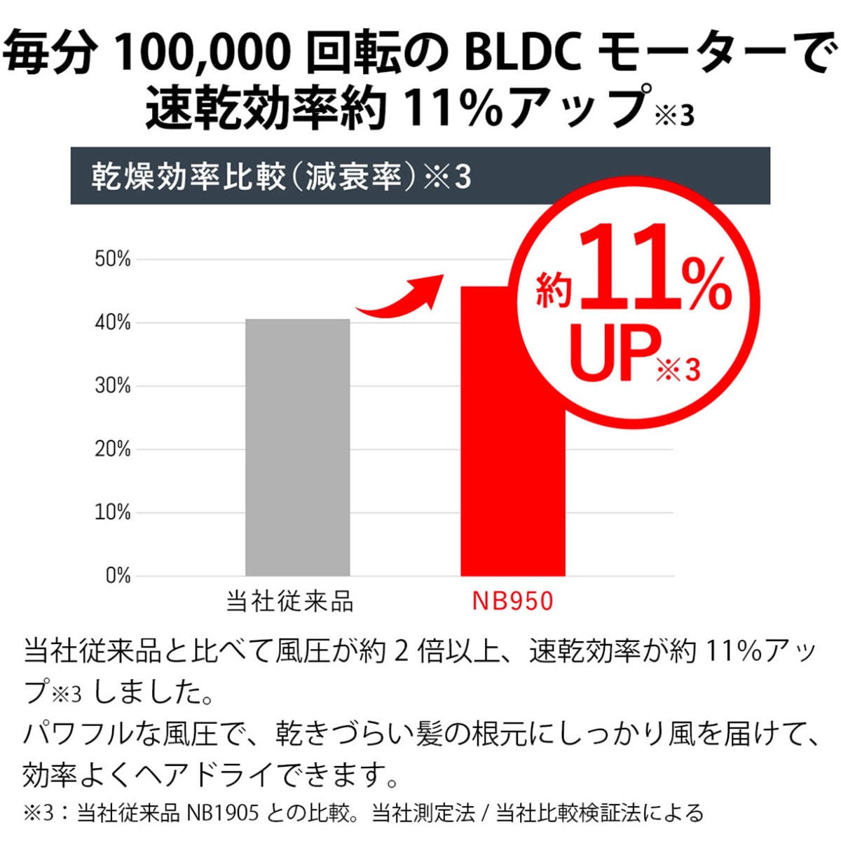 毎分100,000 回転のBLDCモーターを採用し、当社従来品と比べて風圧が約2倍以上、速乾効率が約11%アップ※3しました。パワフルな風圧で、乾きづらい髪の根元にしっかり風を届けて、効率よくヘアドライできます。 ※3:当社従来品NB1905との比較。当社測定法/当社比較検証法による