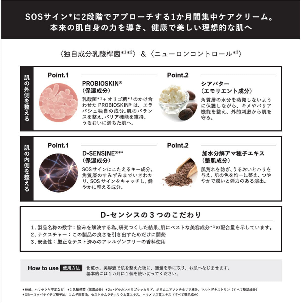 エラバシェ独自の成分、乳酸菌*¹+オリゴ糖*²の掛け合わせたPROBIOSKIN®配合。