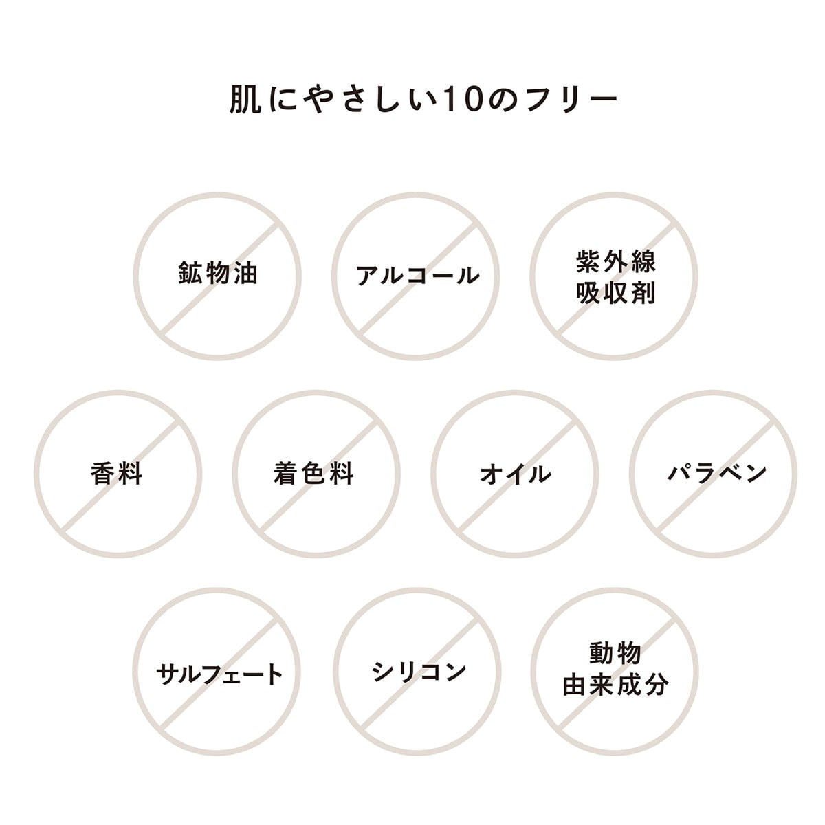 鉱物油、アルコール、紫外線吸収剤、香料、着色料、オイル、パラベン、サルフェート、 シリコン、動物由来成分を含みません。