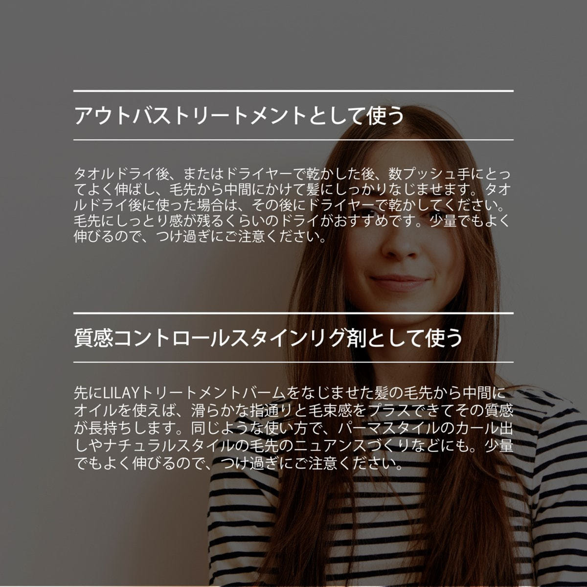 そのまま使うのはもちろん、トリートメントバームなどで下地を整えたヘアに重ね付けして、指通りの滑らかさ、