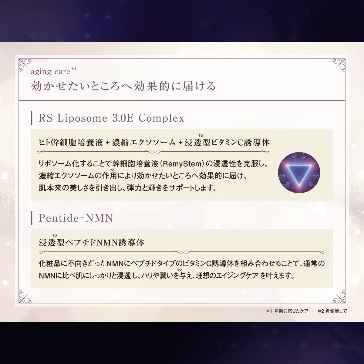 リポソーム化することで幹細胞培養液(RemyStem)の浸透性を克服し、濃縮エクソソームの作用により効かせたいところへ効果的に届け肌本来の美しさを引き出し、弾力と輝きをサポートします。