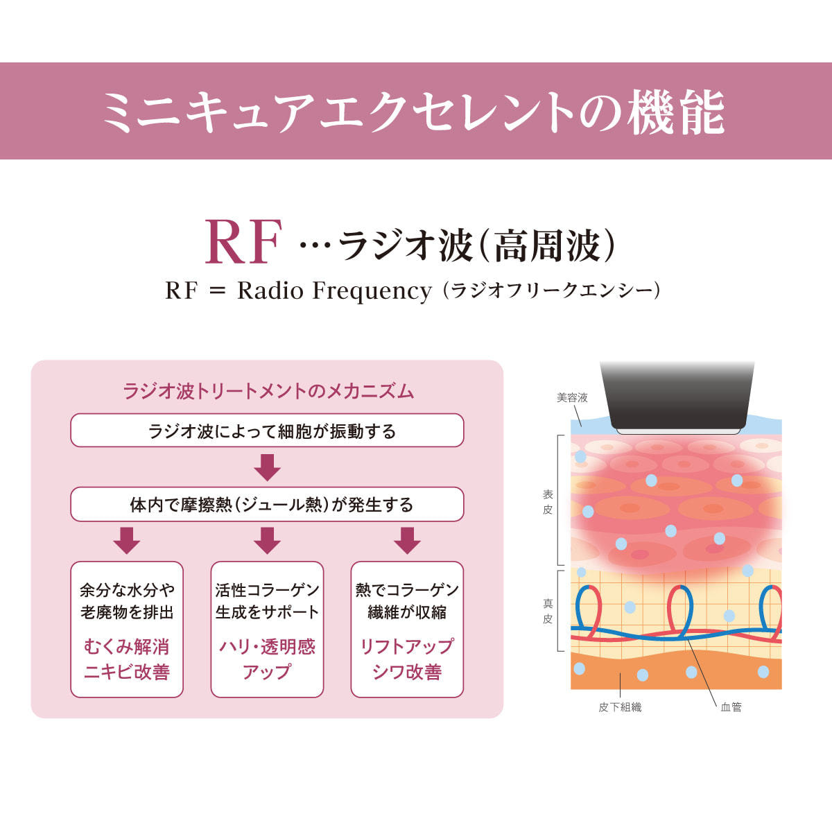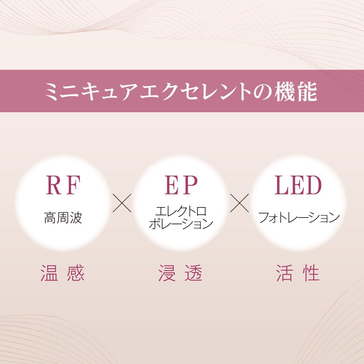 ミニキュアエクセレントは、ラジオ波のパイオニア、日本で唯一、化粧品・美容機器を自社工場で製造している総合美容メーカー:リー・プログループより2012年に発売以来、世界累計販売実績13.7万台の「ミニキュア」がさらなる進化を遂げた美容機器です。