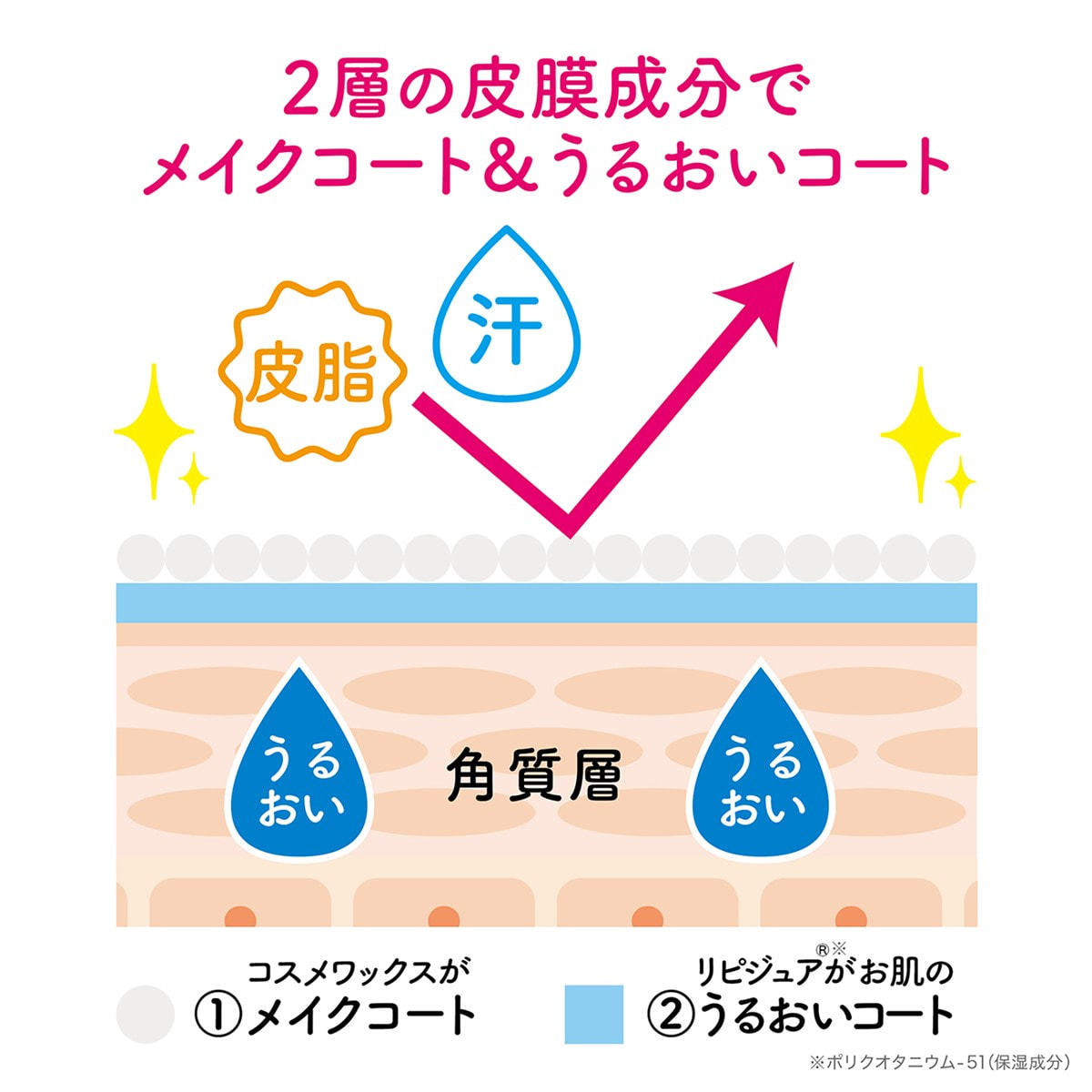 メイクコート原料をエビデンス(科学的根拠)通り1%配合し、2層(メイクコート&うるおいコート)の皮膜成分で化粧崩れ、肌荒れからお肌を守り、長時間美しく保ちます。