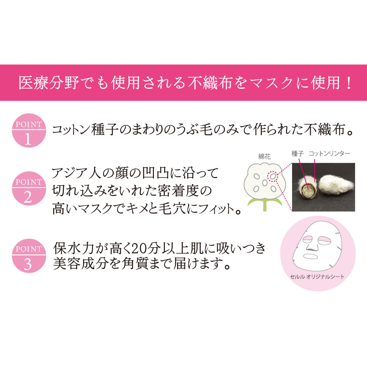 30mlたっぷり美容液を、植物コットンの産毛のみ紡いだ目の細かい不織布にしみ込ませて、隙なく毛穴とキメから美容液を注ぎます。
