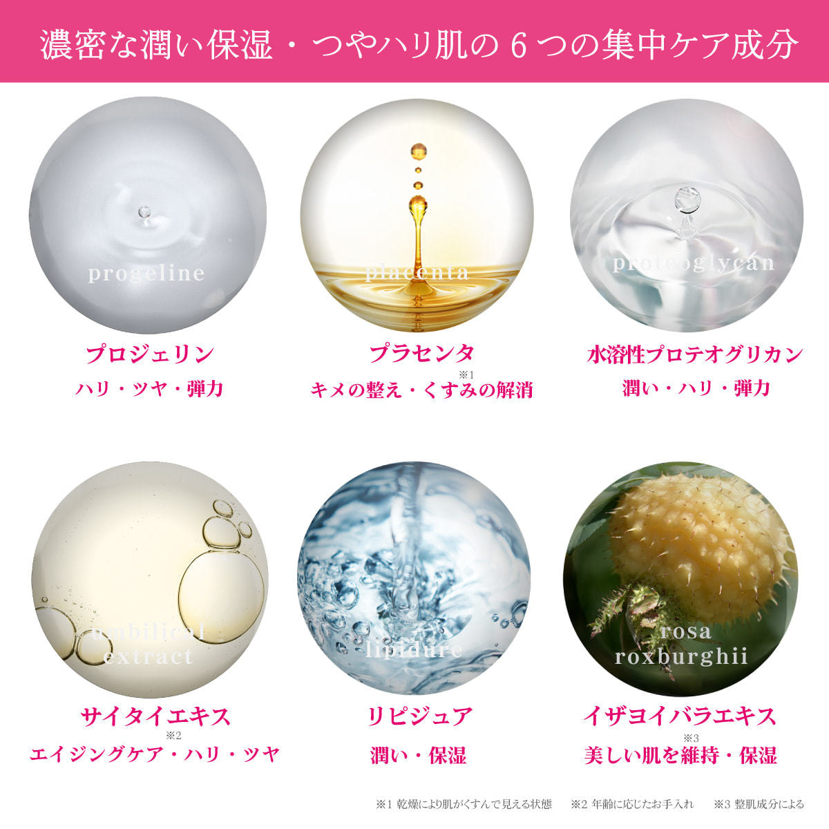 総合的なエイジングケアとして『プロジェリン』『サイタイエキス』『プラセンタ』『プロテオグリカン』『リピジュア』配合。