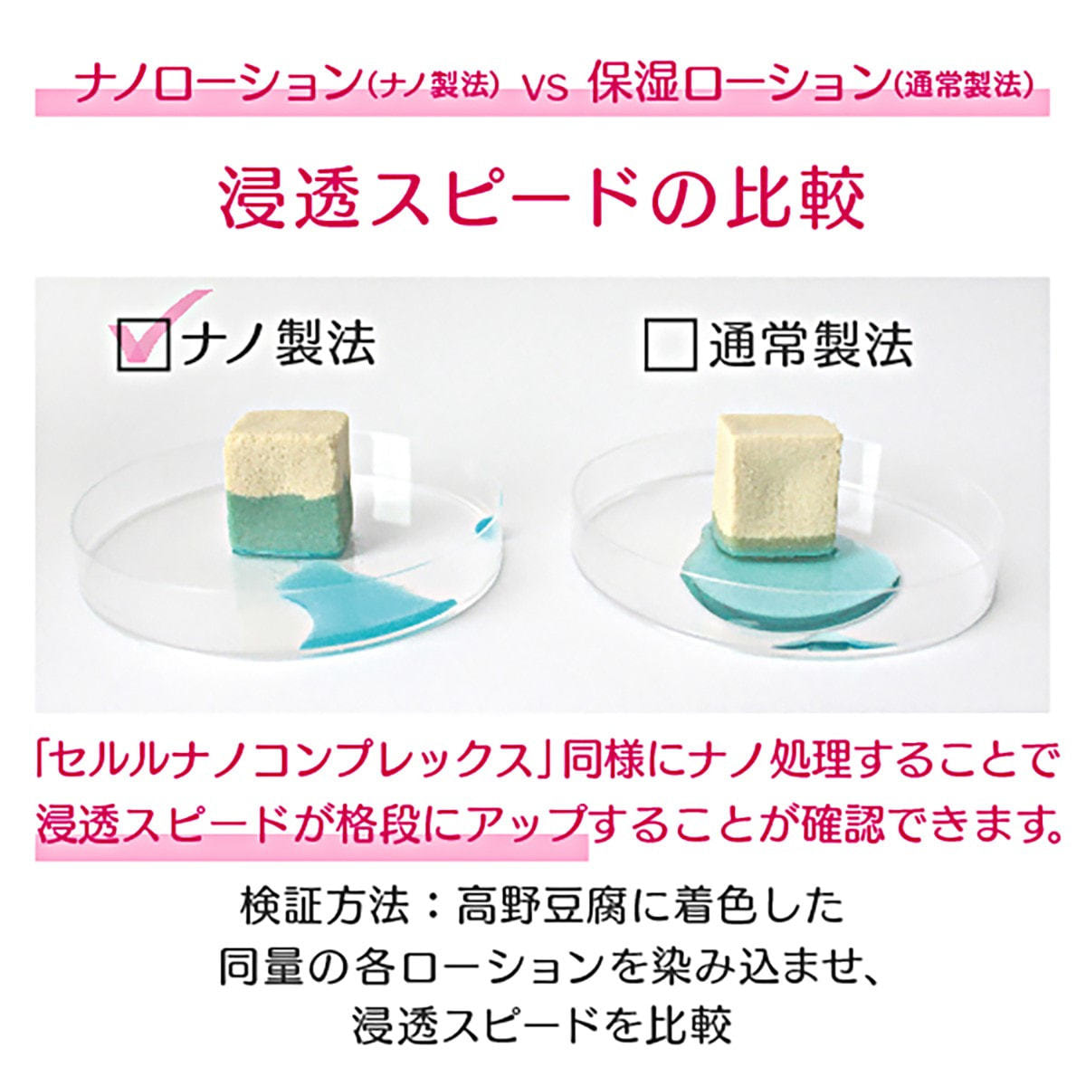 油溶性ビタミンC誘導体や安定型ビタミンA誘導体、栄養豊富な植物エキスを含む14種の美容成分を従来のナノ技術に対し、約1/20サイズにナノカプセル化。