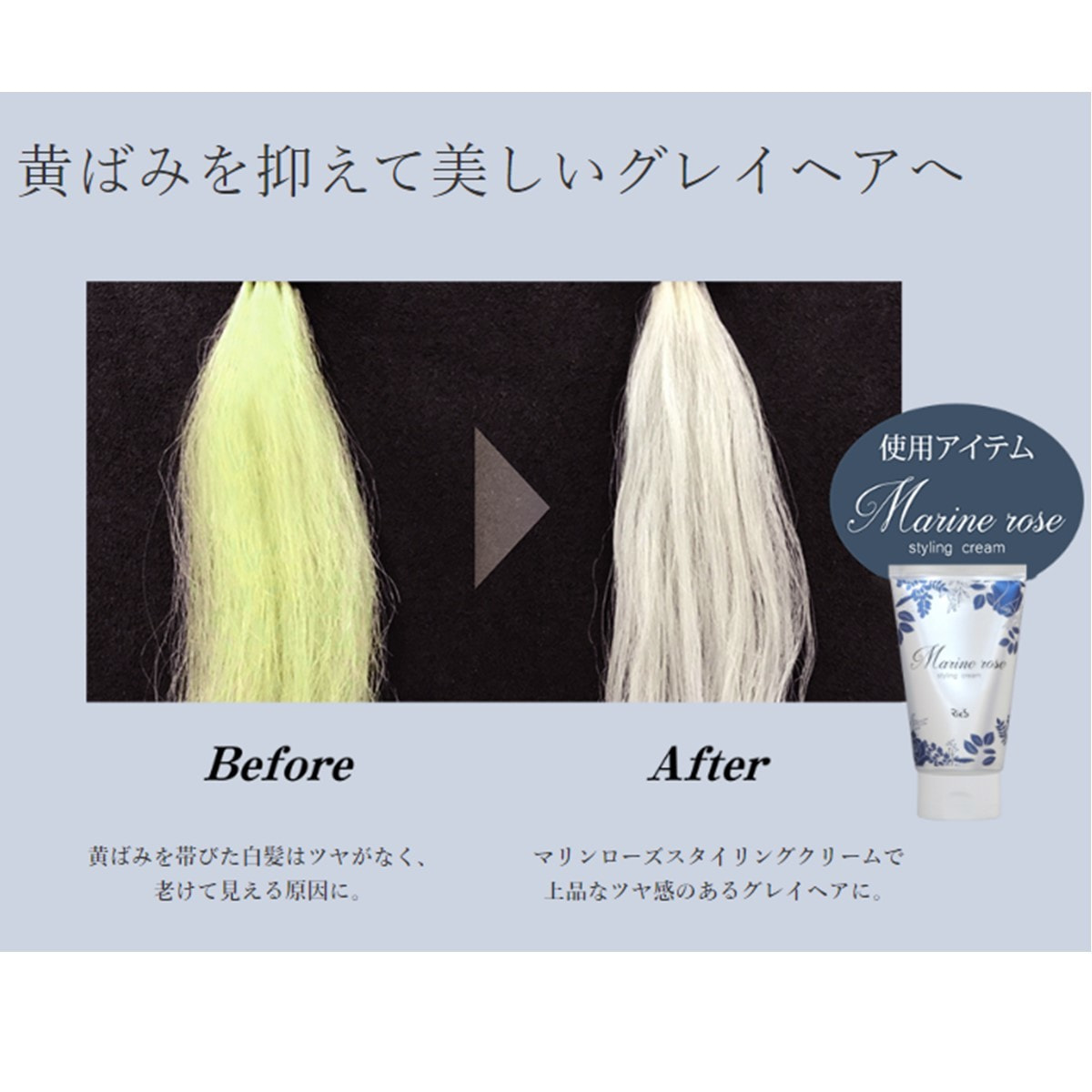 無彩色効果を狙い黄ばみを抑えることで、髪本来のナチュラルな輝きを創り出し、ワンランク上のグレイヘアを演出します。