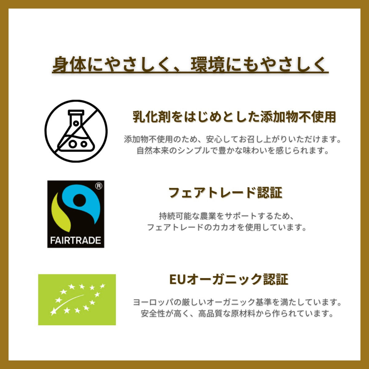 持続可能な農業をサポートするため、フェアトレードのカカオを使用しています。
