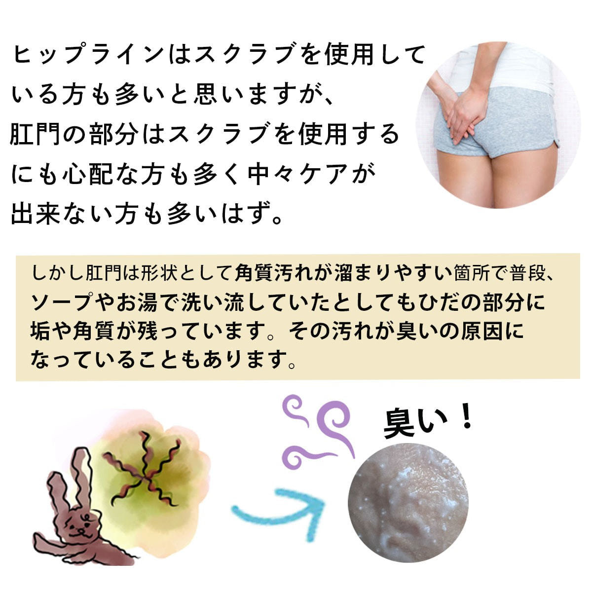 毎日排泄する肛門部分は、ウォッシュレットやソープでは落としきれない汚れが残っています。