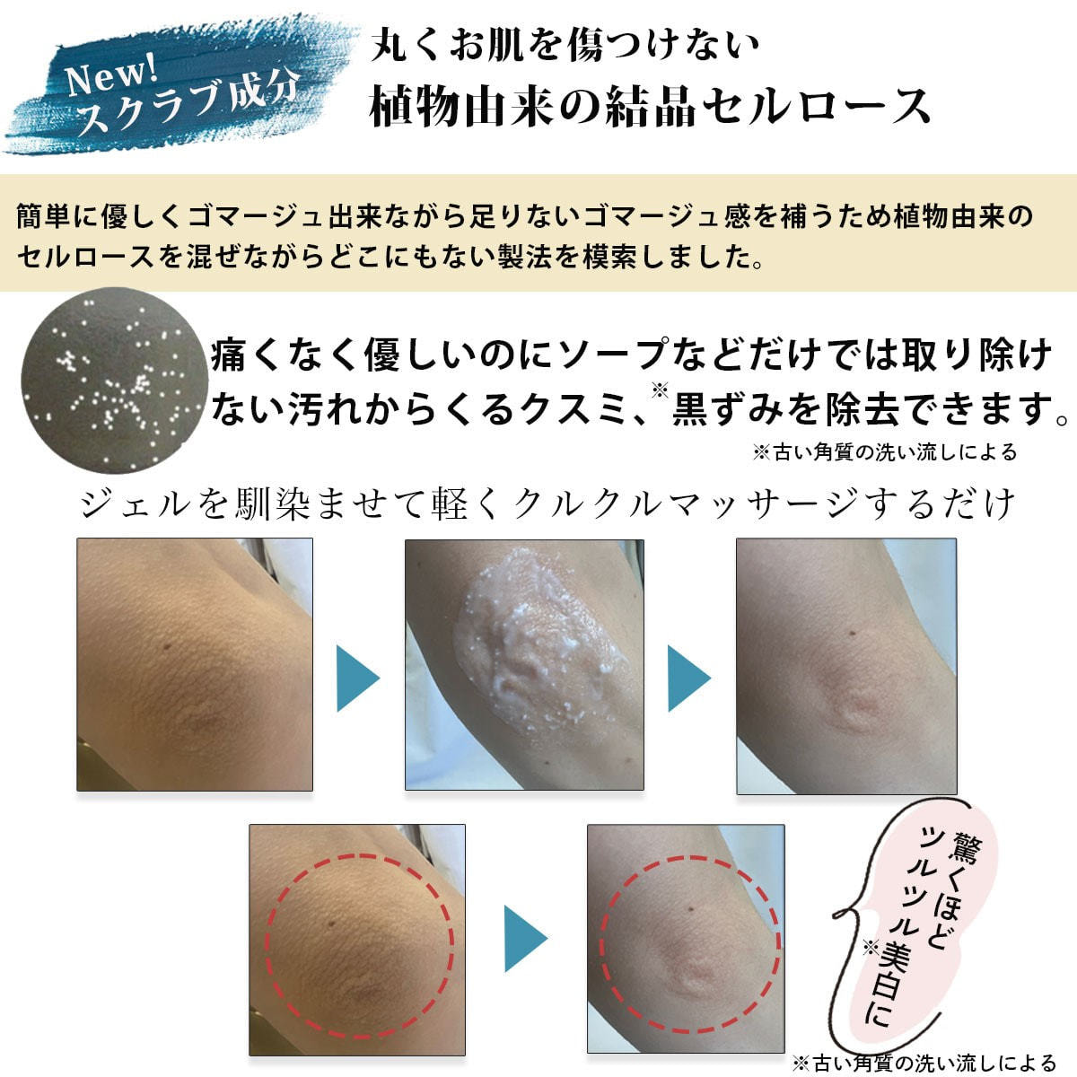 ③スクラブは洗い流してください。お風呂上りにご使用のクリームや美容液を塗るとより効果的です。