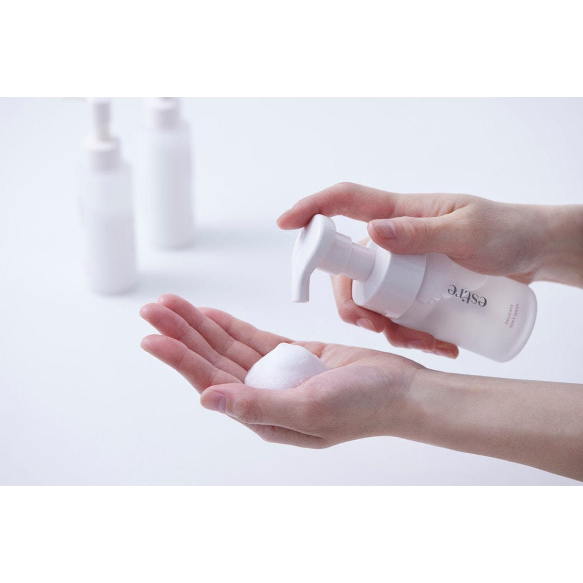 お肌を軽くぬらした後、適量(2~3プッシュ分)の泡を手に取り、手のひらでやさしく洗います。