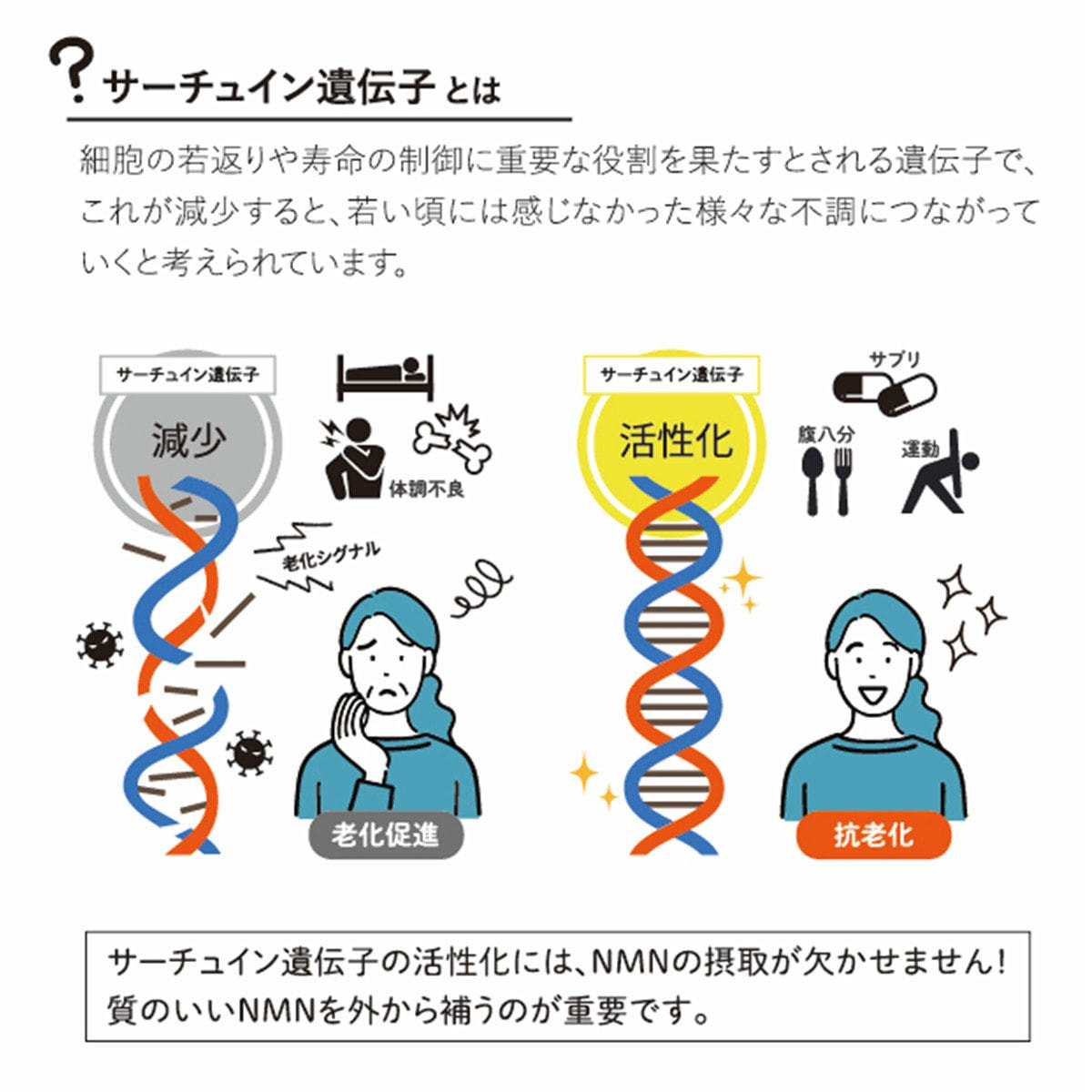 NMNは元々体内で作られる物質で、サーチュイン遺伝子を活性化させます。