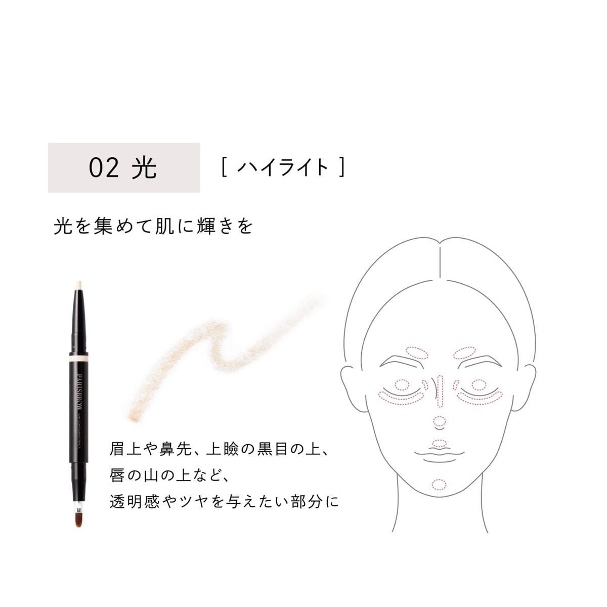 02 光 眉上や⿐先など、透明感やツヤを与えた い部分に