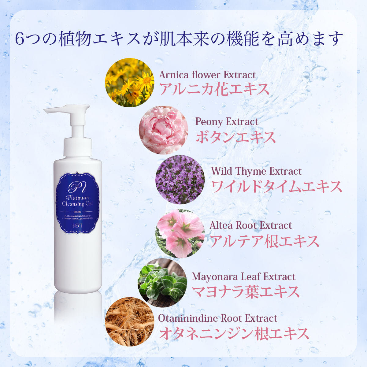 白金ナノコロイド、スクワラン、トルマリン、アルニカ花エキス、ボタンエキス、オタネニンジン根エキス