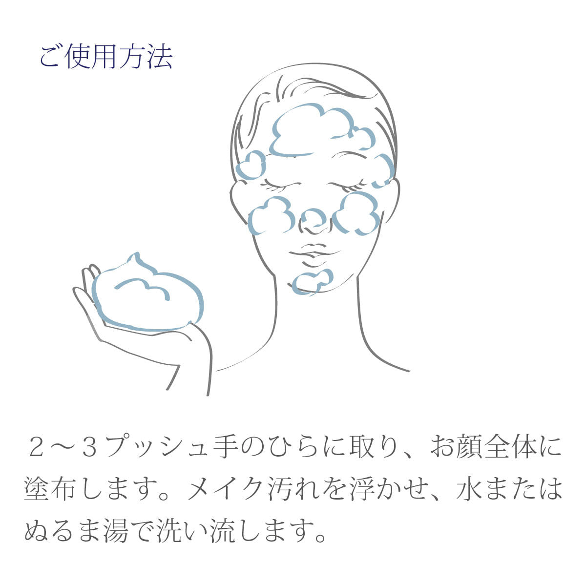 乾いた手に適量をとり、メイクしたままのお顔を包みこむように全体にのばし、軽くマッサージし、水またはぬるま湯で洗い流してください。