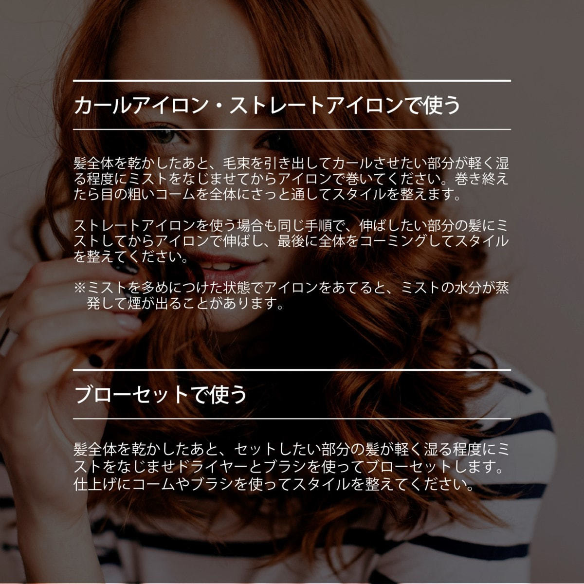 リッジのきれいなカールやウェーブ、しっかりとしたストレートが手軽につくれて長持ちする、ヘアアイロン用のスタイリングミスト。