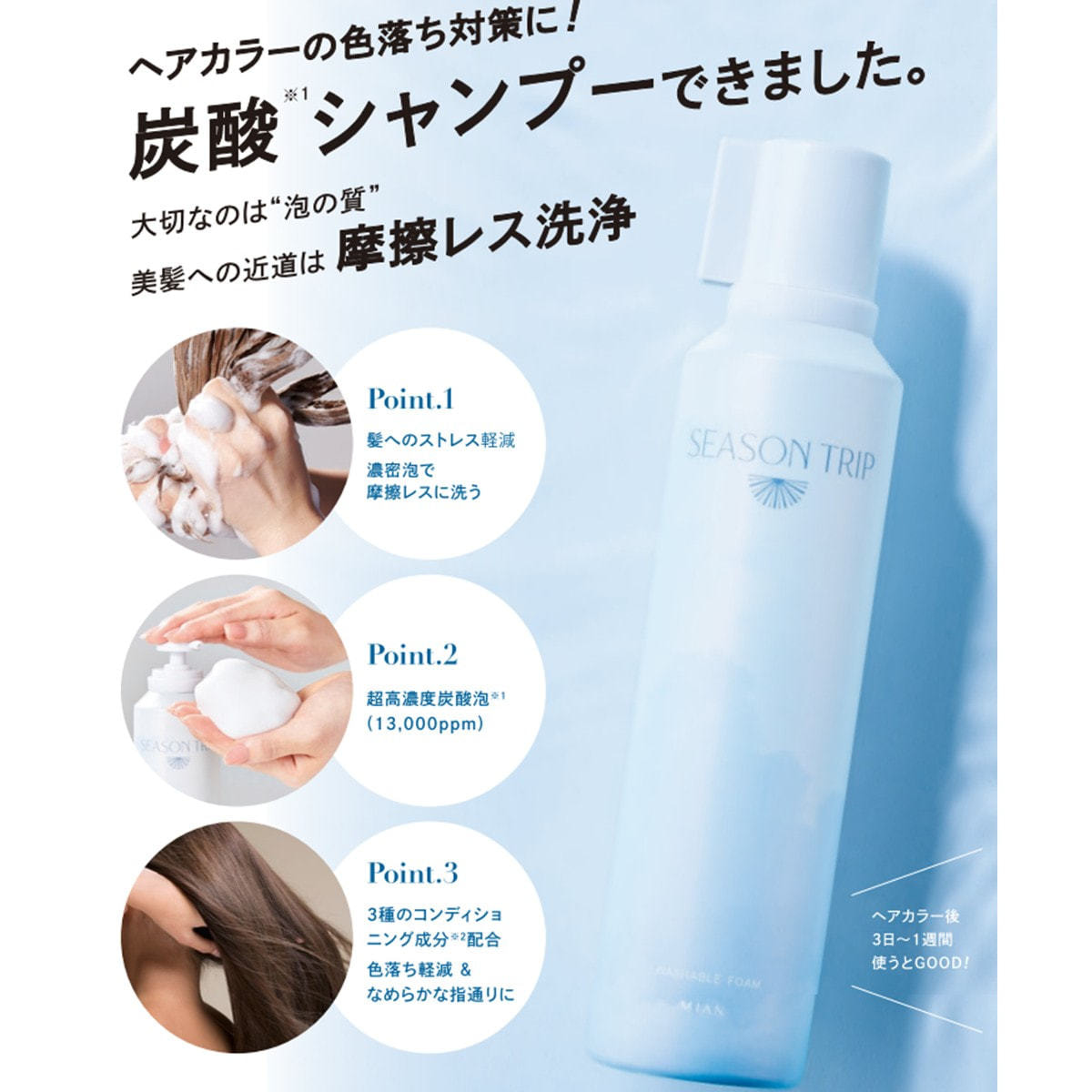 濃密泡でヘアカラー後のデリケートな髪や頭皮を包み込む炭酸シャンプー