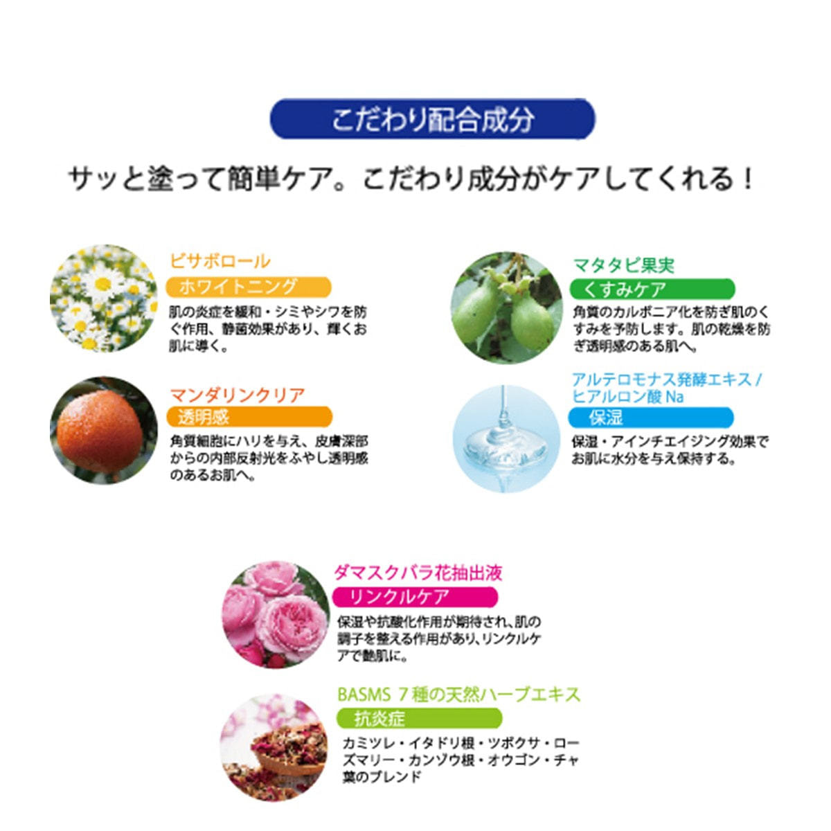 水、マイカ、シクロペンタシロキサン、酸化亜鉛、ジフェニルシロキシフェニルトリメチコン、カプリリルメチコン、イソノナン酸イソトリデシル、ラウリルPEG−10トリス(トリメチルシロキシ)シリルエチルジメチコン、トリ(カプリル酸/カプリン酸)グリセリルPEG/PPG-19/19ジメチコン、酸化チタン、BG、ツボクサエキス、マンダリンオレンジ果皮エキス、オウゴン根エキス、イタドリ根エキス、ビサボロール、カンゾウ根エキス、チャ葉エキス、アセチルヒアルロン酸Na、ヒアルロン酸Na、加水分解ヒアルロン酸、ローズマリー葉エキス、カミツレ花エキス、マタタビ果実エキス、ダマスクバラ花エキス、アルテロモナス発酵エキス、イソステアリン酸、セテス-10、ジメチコン、ミリストイルメチル−β−アラニン(フィトステリル/デシルテトラデシル)、硫酸Mg、水酸化Al、ステアリン酸、ステアリン酸イヌリン、グリチルレチン酸ステアリル、トコフェロール、ペンチレングリコール、フェノキシエタノール、ハイドロゲンジメチコン、メチコン、酸化鉄