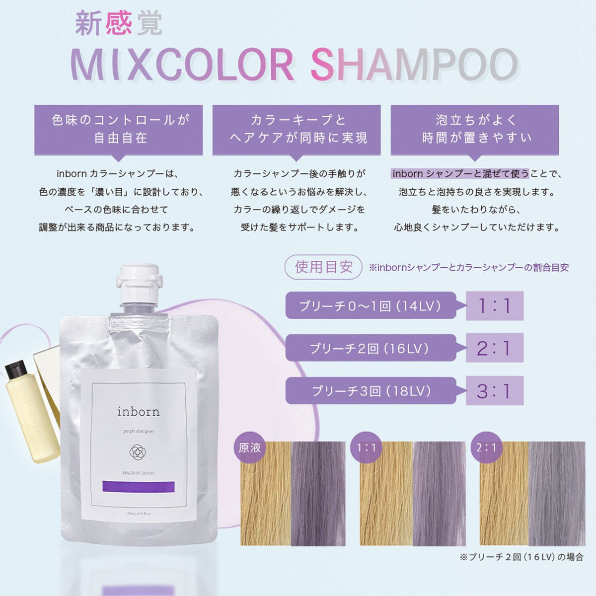 基本的に、「inbornシャンプー:カラーシャンプーを1:1」を目安としておりますが、ブリーチの回数や髪質に合わせて濃度を調整をすることをおすすめしています。