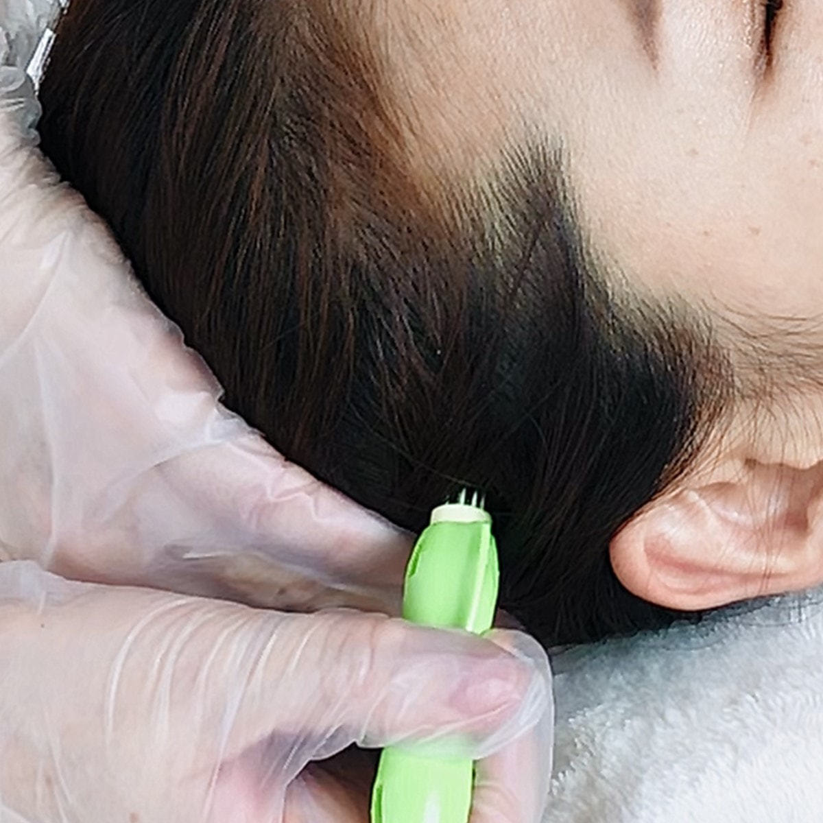 グリーンの柄の部分を持ち、痛みやコリを感じる箇所を中心に、突起部で皮膚を軽くツンツンと押下して刺激します。