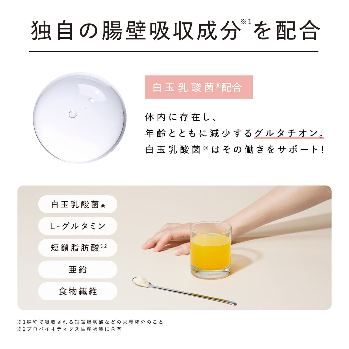 ■酵素ドリンクとして日本初*1配合となる白玉乳酸菌®をはじめとする腸壁吸収成分*2が、腸活*3をサポート
