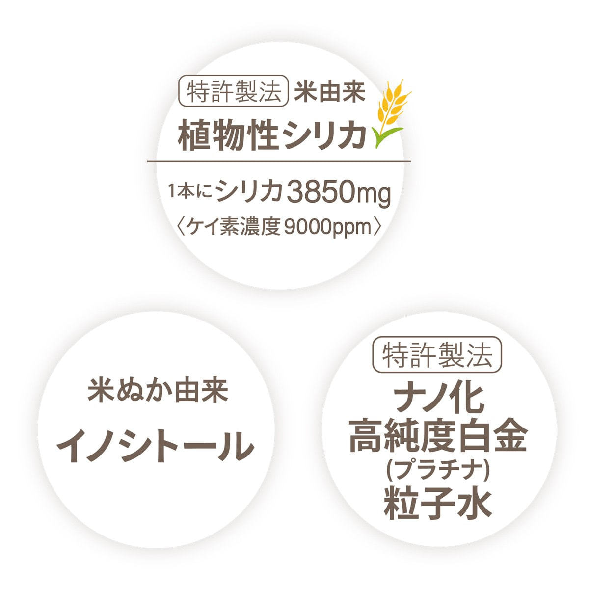 現代人に不足しがちな必要不可欠な成分を手軽に摂取できるよう、農薬不使用・国産米から特許製法により抽出した米由来「植物性シリカ」を高濃度・濃縮配合。